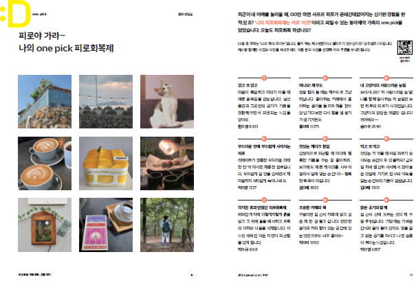 2023년은 8개월 정도 만성 피로에 시달린 힘든 해였어요. 심리적으로 약해진 건지 병원을 찾게 되었죠. 무기력증을 동반한 갱년기 증상이었습니다. 약물 복용과 금주로 지금은 건강을 되찾았습니다. 회사 생활을 열심히 하는 것도 좋지만 자신의 건강을 지키는 것이 역시 최우선입니다. - 강원 강릉시 홍재형 님