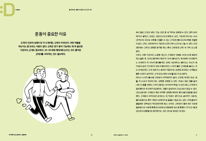 essay에 소개된 ‘운동이 중요한 이유’를 꼼꼼히 읽었습니다. 꾸준히 걷기 운동을 하고 있지만 솔직히 가끔은 핑계를 대며 건너뛰기도 했습니다. 이번 기사를 통해 근육과 근력에 대하여 이제 확실히 알게 되었고, 재테크보다 근테크, 그리고 균형 잡힌 영양 섭취의 중요성을 절실하게 깨달았습니다. 고맙습니다.
