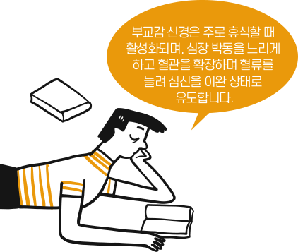 또 다른 예로 자율 신경계를 들 수 있다. 교감 신경은 활동 시에 심박수를 높이고 혈관을 수축시켜 혈압을 올리며, 소화관의 운동을 감소시킨다. 부교감 신경은 주로 휴식 시에 활성화되며, 심장박동을 느리게 하고 혈관을 확장하며 혈류를 늘려 심신을 이완 상태로 유도한다. 위험한 상황에 처했을 때와 같이 스트레스가 심한 상황에선 교감 신경의 역할이 필요하지만, 이러한 상태가 평상시에도 계속 지속된다면 몸이 견디지 못할 것이다. 교감 신경과 부교감 신경의 협력으로 혈압과 심박이 일정 범위 이내로 적절하게 유지되듯, 우리는 항상성을 통해 외부 환경의 변화에도 신체 기능과 건강을 유지할 수 있다.