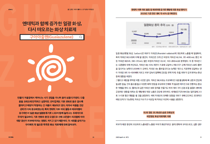 요즘 피부가 예민해져서 성분 하나하나 꼼꼼히 따져 보는데, 구아야줄렌이라는 성분에 대해 알게 되면서 참 흥미로웠어요. 예로부터 캐모마일은 고대 바빌로니아 시절부터 다양한 질환에 쓰였고, 유럽에서는 감기, 위장 질환, 피부 트러블에 두루 사용되던 ‘가정 상비약’이었다고 하니 그만큼 오랜 시간 사랑받은 식물이란 게 느껴지더라고요. <동아약보>를 통해 알게 된 동아제약의 ‘리큐번’ 제품을 꼭 한번사용해 보고 싶다는 생각이 들었어요.