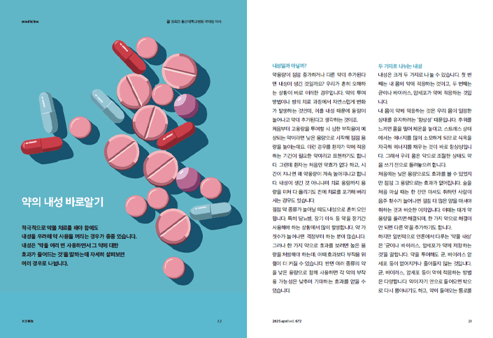 평소에 다소 많은 종류의 약을 복용하고 있어 내성이 염려되던 차였는데, 이번 호에 소개된 ‘약의 내성 바로 알기’가 유용한 지침이 되었습니다. 세계보건기구는 인류의 생존을 위협하는 열 가지 중 하나로 항생제 내성을 꼽았고, 우리나라도 항생제 내성을 해결하기 위해 국가 차원에서 많은 노력을 기울이고 있다고 하니 의료진과 복용자 모두 동참하여 항생제의 올바른 사용을 위해 노력해야겠습니다.