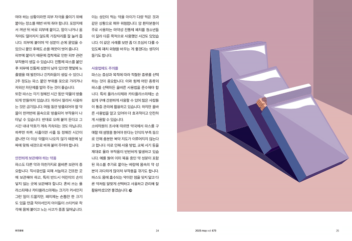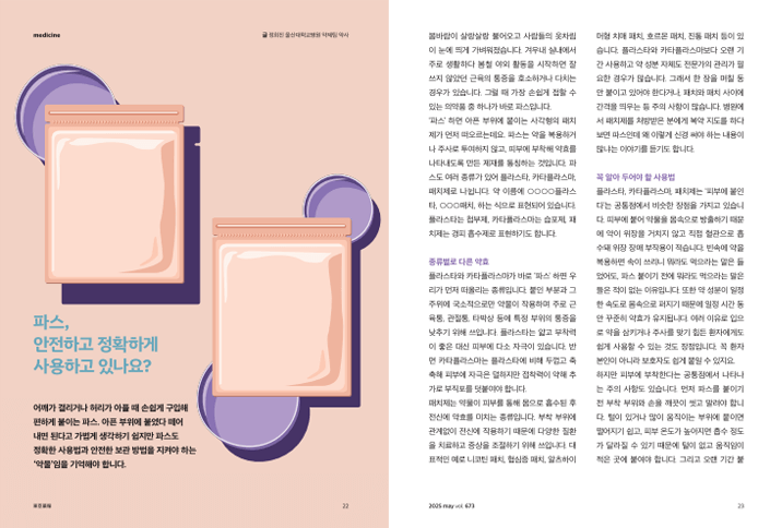 평소 등산 같은 운동을 즐겨 하다 보니 어깨나 팔다리에 파스를 자주 붙이고 있어 ‘파스, 안전하고 정확하게 사용하고 있나요?’가 특히 유익한 정보였습니다. 이제까지는 그냥 편하게 파스를 사용했는데 파스도 정확한 사용법과 안전한 보관 방법을 지켜야 하는 약물임을 깨닫는 시간이 되었습니다.