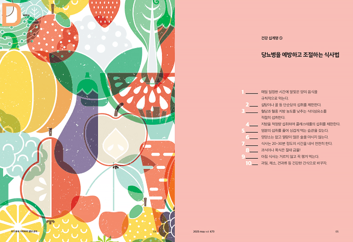 보약 같은 건강 십계명을 매 호마다 꼼꼼히 살펴보고 다이어리 노트에 옮겨 적어 둡니다. 당뇨 전단계로 진단받아 늘 긴장하며 생활하는데요. 그러다 십계명을 보고 매일 일정한 시간에 식사하지 못하는 것과 직장 생활로 인해 식사를 급히 하는 것이 잘못된 습관임을 깨달았습니다. 늦었다고 여기지 않고 이제라도 철저히 수행하고자 노력하고 있습니다. 당뇨병을 예방하는 식사법으로 당뇨에서 자유로워질 것을 확신합니다.