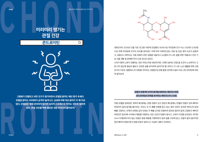 요즘 TV에서 콘드로이틴 광고를 자주 봤어요. 콘드로이틴이 약 이름인 줄 알았는데 실제 우리 몸에 있는 성분이라는 걸 <동아약보>를 읽고 알았네요. 부모님이 나이 드시면서 무릎이 아프다는 말씀을 자주 하시는데, 관절 건강에 좋은 콘드로이틴에 관심을 가져봐야겠어요.