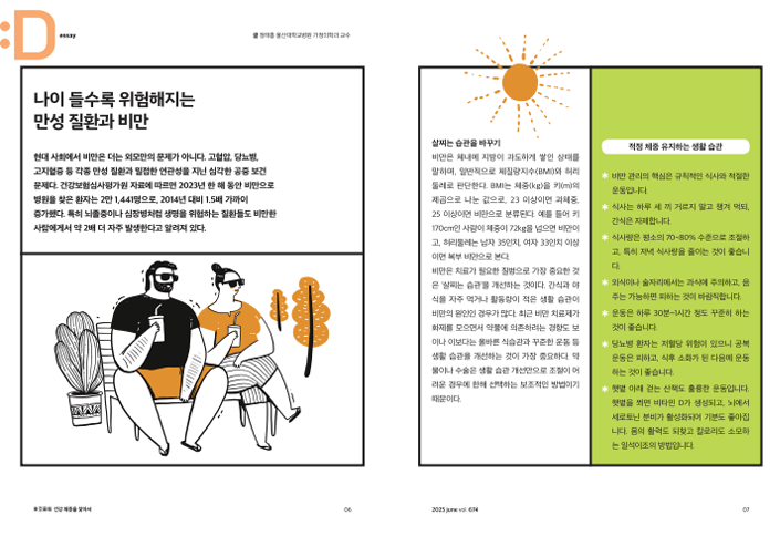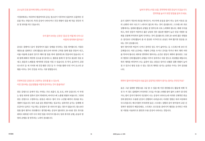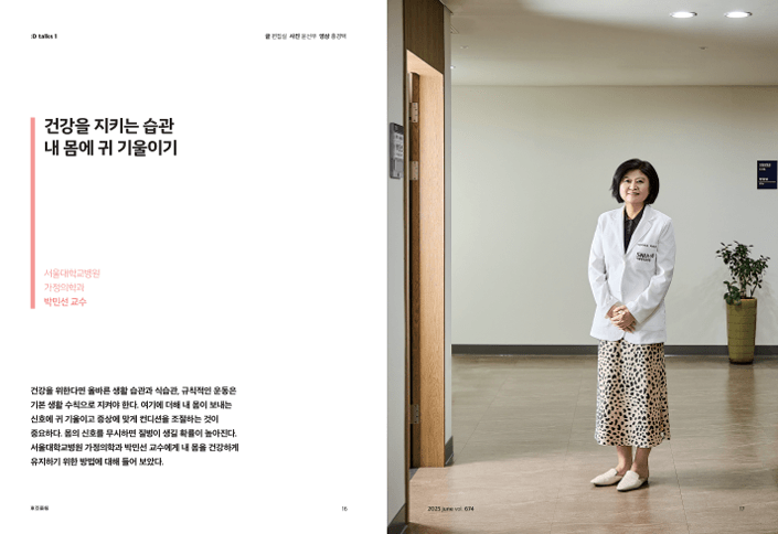 모든 칼럼이 두루 좋았지만 그 중에서도 박민선 교수님의 인터뷰가 제일 기억에 남네요. 요즘 SNS에서는 건강정보가 마구 쏟아지는데 교수님 인터뷰를 통해 진정으로 건강하게 사는 법이 무엇인지 깨닫게 되었습니다. 건강을 지키는 습관, 내 몸에 귀 기울이기, 저도 앞으로 꼭 실천해보려 합니다.