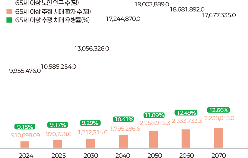 수명이 길어지면서 인구 고령화는 세계적인 현상이 됐다. 우리나라도 예외는 아니다. 전체 인구에서 노인 인구가 차지하는 비중이 2015년 13.1%에서 2060년에는 40.1%로 늘어날 전망이다. 인구 고령화로 인해 치매 환자 수도 급격한 증가세다. 대한민국의 치매 현주소를 짚어본다.