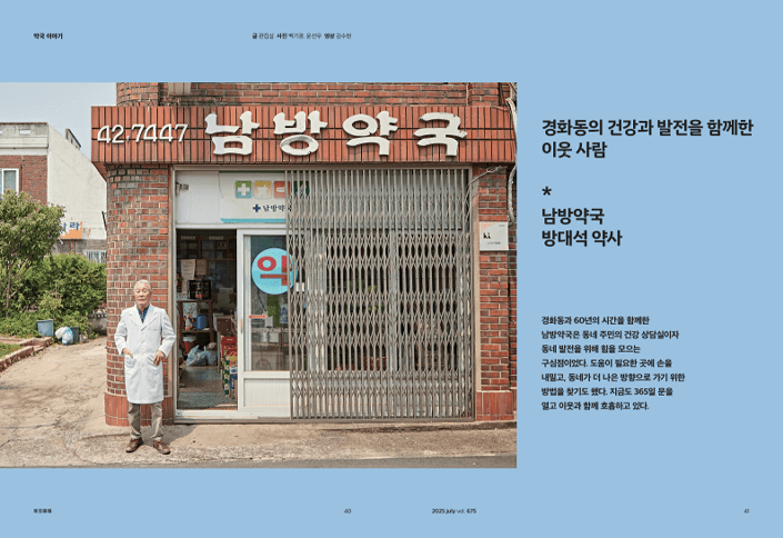 경화동과 60년의 시간을 함께하며 주민들의 상담실이기도 하지만 동네 발전을 위해 힘을 모으는 구심점 역할까지 자처해온 남방약국과 방대석 약사님의 모습이 자랑스러웠습니다. 도움이 필요한 곳에 적극적으로 손을 내밀어 온정을 나눌 뿐만 아니라 동네가 더 좋은 방향으로 갈 수 있도록 다양한 방법을 찾아온 남방약국, 365일 문을 열어 다급한 이들에게 든든한 동반자가 되어준 약사님의 모습이 아름답습니다.