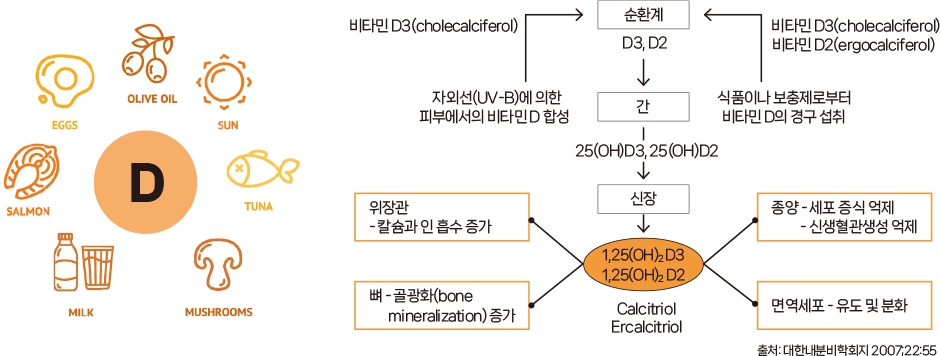 비타민 D는 햇빛 노출에 의한 피부 생합성과 생선, 달걀, 유제품 등의 식품 섭취를 통해 우리 몸에서 만들어진다. 7-디히드로콜레스테롤은 사람의 피부에 함유된 물질로, 자외선(UV-B)이 닿으면 비타민 D3로 전환된다. 음식이나 보충제를 통해서도 비타민 D2, D3를 보충할 수 있다. 비타민 D2는 버섯 섭취나 태양광 노출로, 비타민 D3는 육류나 생선 섭취로 획득 가능하다. 비타민 D2, D3는 활성호르몬의 전단계인 프로호르몬(pro-hormone)의 형태라 간과 신장에서 활성형으로 전환되어야 생물학적 기능을 발휘할 수 있다.