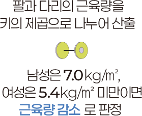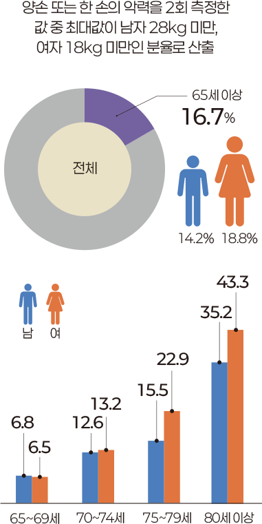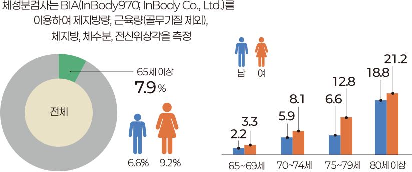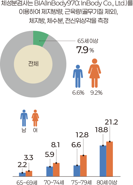 근감소증은 노화에 따라 근육량과 근력이나 신체수행능력이 감소한 상태로, 이로 인해 낙상과 골절 위험이 증가하고 당뇨병, 고혈압, 심뇌혈관질환 등 만성질환의 발생도 증가하게 된다. 2022년 국민건강영양조사 근감소증 조사 결과, 남자 6.6%, 여자 9.2%로 여자가 남자보다 유병률이 높은 것으로 나타났다.