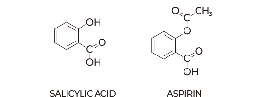 이렇게 발견된 살리실산에 아세틸기를 결합하여 만들어진 아세틸살리실산은 현재까지도 소염진통제로 활발히 쓰이는 아스피린이다. 메틸기를 결합한 살리실산메틸은 국소 통증 완화를 위한 파스류에 사용된다. 살리실산 자체는 전신적인 소염진통제보다는 각질 용해 및 침투 특성을 활용한 외용제 성분으로 주로 사용된다. 살리실산의 산해리정도(pKa)는 약 3 정도로 비교적 산도가 높아 각질과 피지를 용해할 수 있고, 지용성 특성 덕분에 피부 깊숙이 침투할 수 있다. 농도에 따라 강도가 달라지며, 이를 활용하여 화장품부터 여드름 관리제, 티눈 치료제에 이르기까지 적용 범위가 넓다.