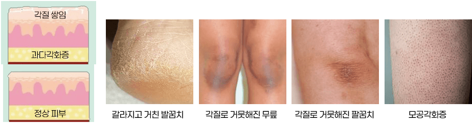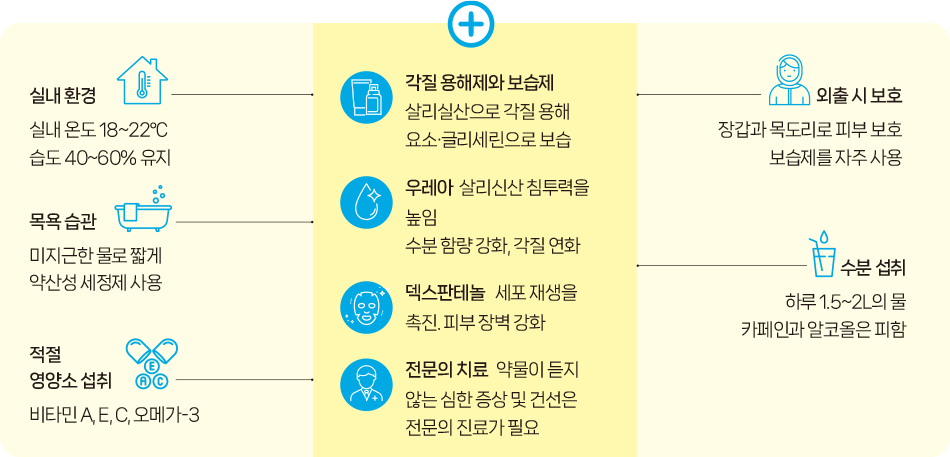 생활요법만으로 호전되지 않는 경우, 살리실산과 같은 각질 용해제를 활용하면 피부에 많은 자극을 주지 않으면서도 두꺼워진 각질층의 자연스러운 회복을 도울 수 있다. 여기에 우레아, 덱스판테놀을 병용하면 살리실산의 효과를 증대하면서 피부 장벽 회복과 재생을 촉진할 수 있다.