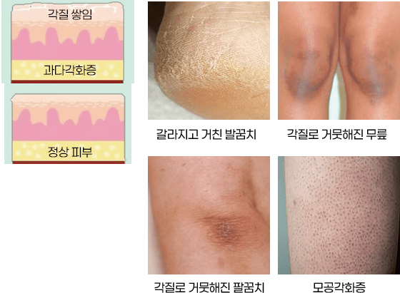 정상 각질세포는 약 2~4주를 주기로 생성과 탈락을 반복하며 균형을 이루는데, 이 균형이 깨지고 각질이 과다하게 축적되면 과다각화증이 된다. 하중 압력을 많이 받는 발뒤꿈치와 발바닥, 마찰이 잦은 팔꿈치와 무릎에서 자주 발생한다.