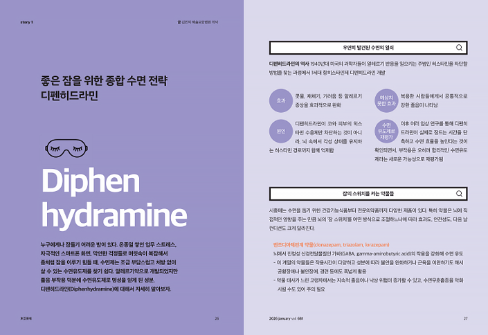 요즘 제 주변에 밤잠을 설쳐서 피곤하다는 사람들이 많이 있습니다. 수면제에 의존해서 잠을 잔다고 하더라고요. 1월호에 실린 ‘좋은 잠을 위한 종합 수면 전략 디펜히드라민’ 칼럼을 접하고 많은 도움을 받았습니다. 다 읽고 난 후 잠 못 자는 분들에게 알려주었더니 감사하다는 인사도 받았습니다. 좋은 정보, 내용 감사합니다. 2026년 새해에도 좋은 내용 기대됩니다. 새해 복 많이 받으세요.