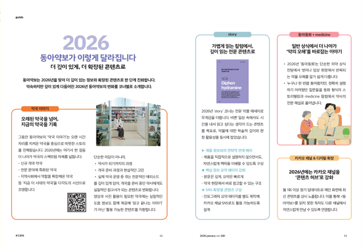 2026년 동아약보가 변화한다는 소식을 듣고 매우 기쁩니다. 약국이야기, 깊이 있는 칼럼 그리고 약의 오해를 바로잡는 콘텐츠 등 다양한 코너가 새롭게 변화한다니 기대가 큽니다. 특히 약국의 역사와 현재를 기록하는 부분은 많은 독자들에게 유익한 정보가 될 것 같습니다. 또한 카카오톡 채널을 콘텐츠 허브로 강화하는 점도 매우 흥미롭습니다. 디지털 시대에 발맞춰 다양한 플랫폼에서 쉽게 접근할 수 있는 정보는 독자들에게 큰 도움이 될 것입니다. 앞으로도 동아약보가 더욱 풍성하고 깊이 있는 콘텐츠로 독자들과 소통할 수 있기를 바랍니다. 동아약보의 새로운 시작을 응원합니다.