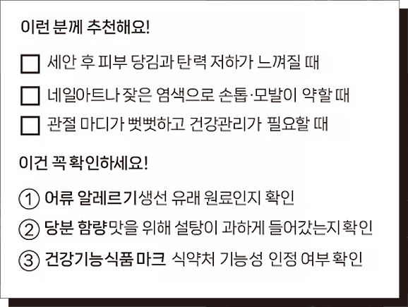 안타깝게도 체내 콜라겐은 20대 중반부터 매년 1%씩 감소하며, 폐경 이후에는 5년 안에 전체의 30%가 급격히 사라집니다. 이미 다 빠져나간 뒤에 보충하기보다, ‘피부 저축’이라 생각하고 매일 일정한 시간에 꾸준히 섭취하는 습관이 중요합니다. 액상이나 가루 등 본인이 가장 편하게 챙길 수 있는 제형을 선택하세요.
