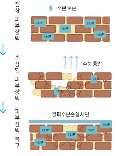 피부에서 가장 바깥층인 각질층은 각질세포라는 벽돌 사이사이를 세라마이드, 콜레스테롤과 같은 지질과 천연보습인자(NMF, Natural Moisturizing Factor)로 채워져 있으며, 피부 속 수분 증발을 막는 장벽으로 작용한다. 건조한 환경, 잦은 세안, 노화 등으로 지질층과 NMF가 손상되면 피부장벽에 틈이 생기고, 피부 속 수분이 빠르게 증발하게 된다. 이를 경피수분손실(TEWL, Transepidermal Water Loss)이라고 하는데, 건조한 피부일수록 이 수치가 높아진다.