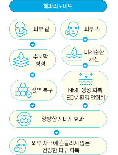 보습제는 작용 방식에 따라 습윤제, 연화제, 밀폐제로 나뉜다. 헤파리노이드는 수분을 끌어당기는 습윤제로서 보습 효과를 발휘하는 동시에 미세순환 개선과 항염 작용을 통해 손상된 피부 환경의 정상화에 도움을 주는 치료제다.